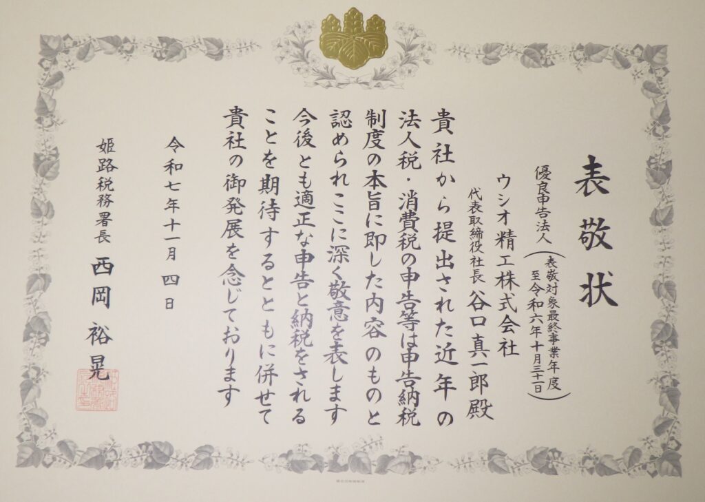 姫路税務署長より表敬を受け、優良申告法人として表敬状を拝受しました。