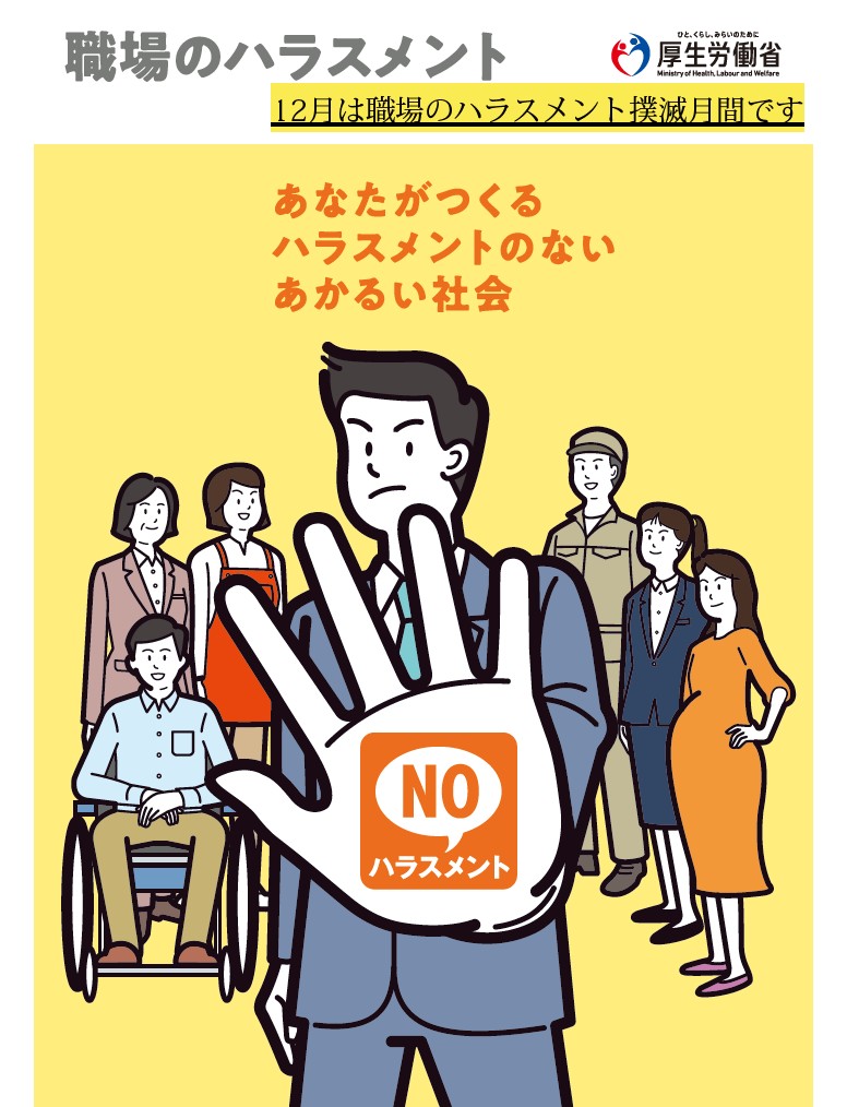 12月、厚労省の定めたハラスメント撲滅月間にあわせ、社内でも防止啓発運動を実施中です。各部署朝礼に総務担当者が同席し内容の説明を実施しています。