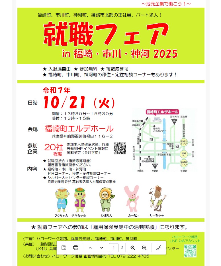 ハローワークステーション姫路、兵庫労働局、福崎町、市川町、神河町の主催による就職フェアが10月21日に開催され、当社も参加します。現在参加の応募受付中ですので、ご希望される方はハローワークステーション姫路(TEL:079-222-4785)までお問い合わせください。